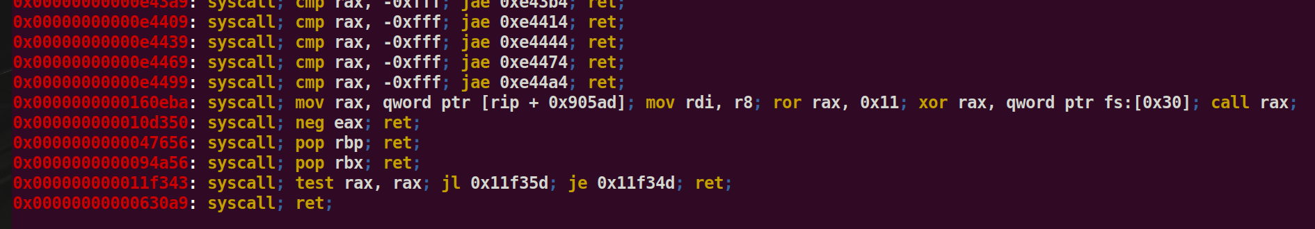 ropper –file=/root/glibc-all-in-one/libs/2.31-0ubuntu9.16_amd64/libc.so.6 –search “syscall”